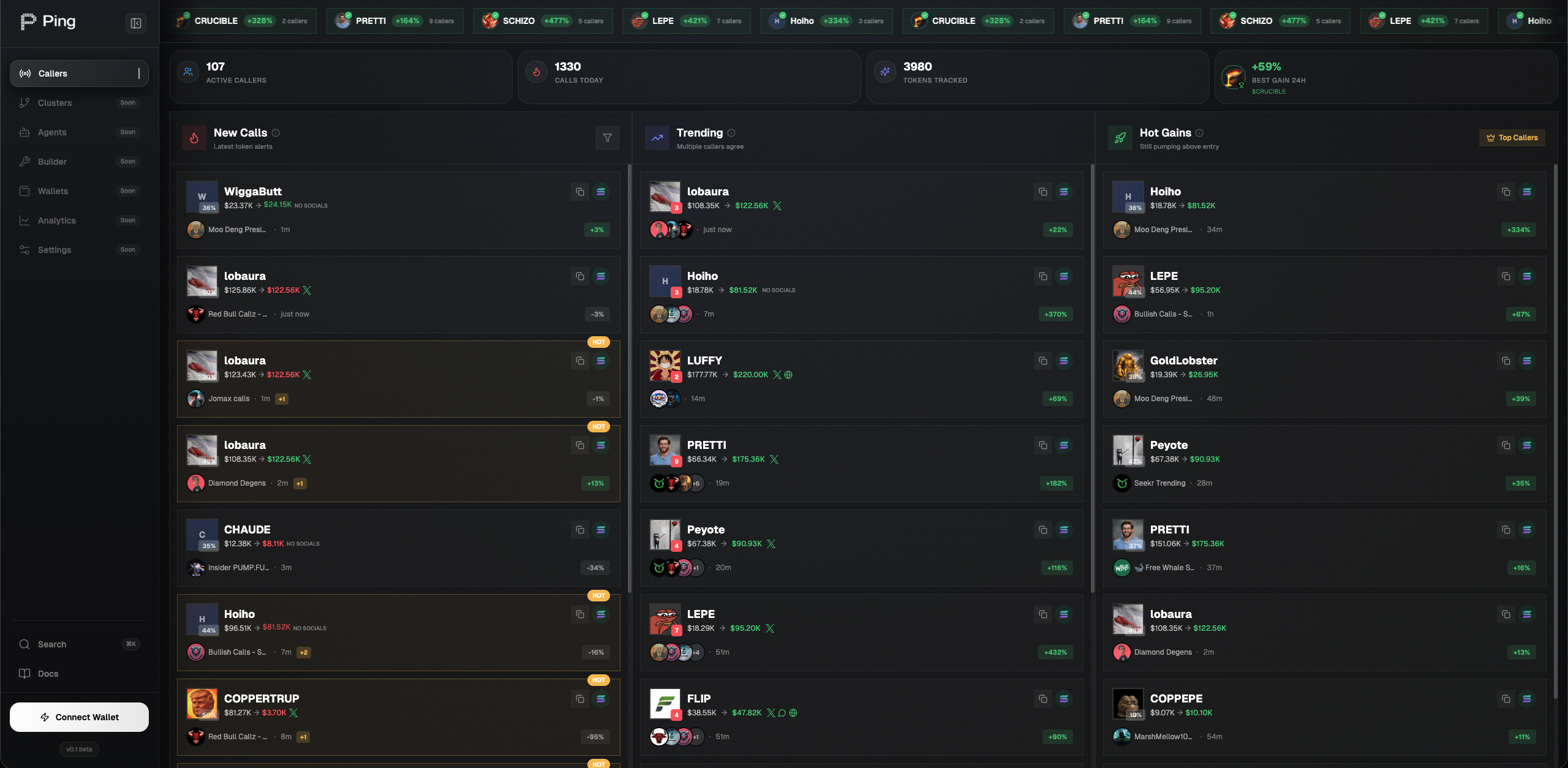 Ping is a trading intelligence platform for Solana. We track Telegram callers, detect coordinated wallet clusters, and surface the signals that matter — so you can trade with conviction instead of hope.