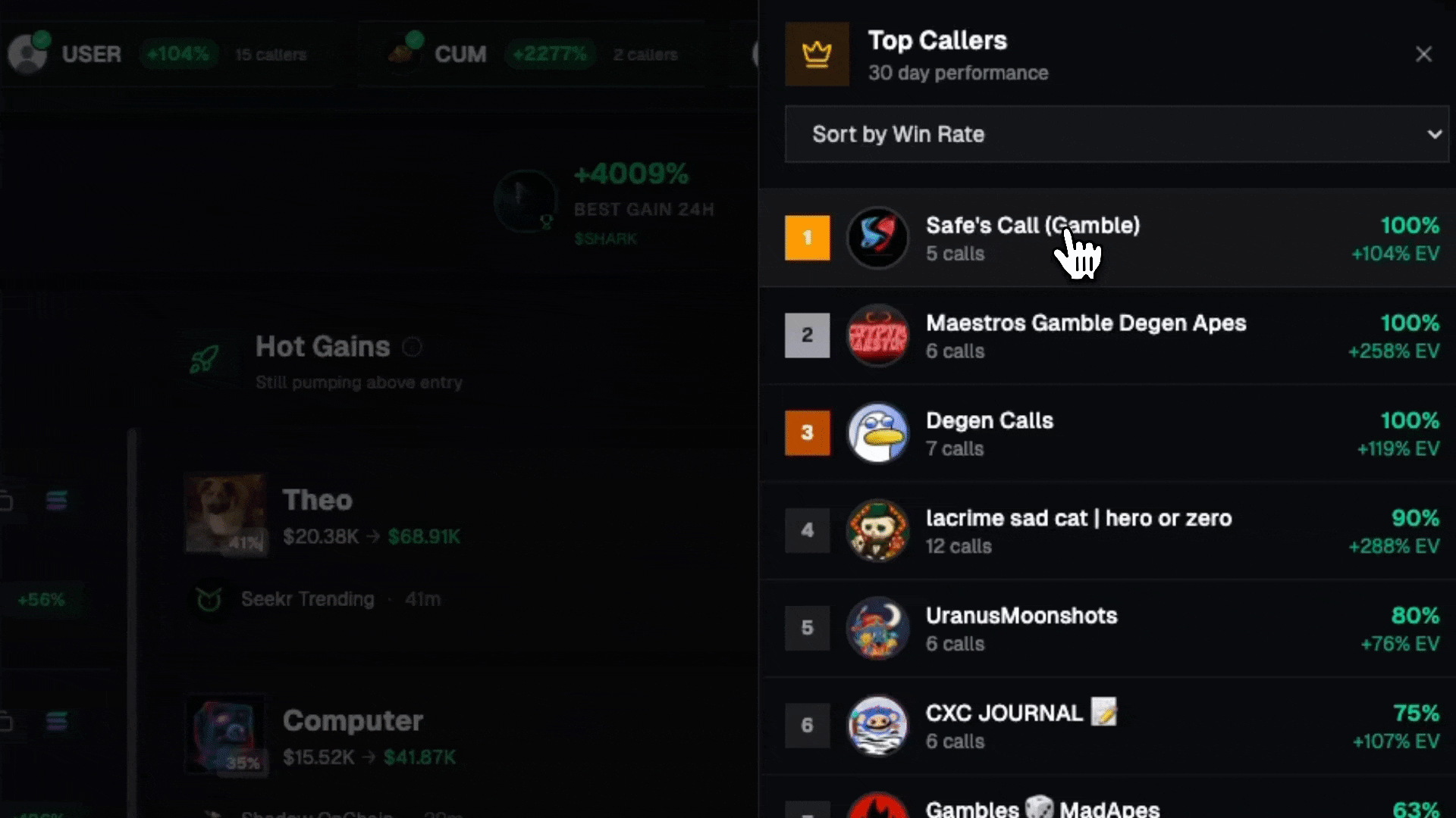 Win rates at 2x, 5x, 10x. Average ROI per caller. Time to peak. Everything you need to know if a caller actually makes money.