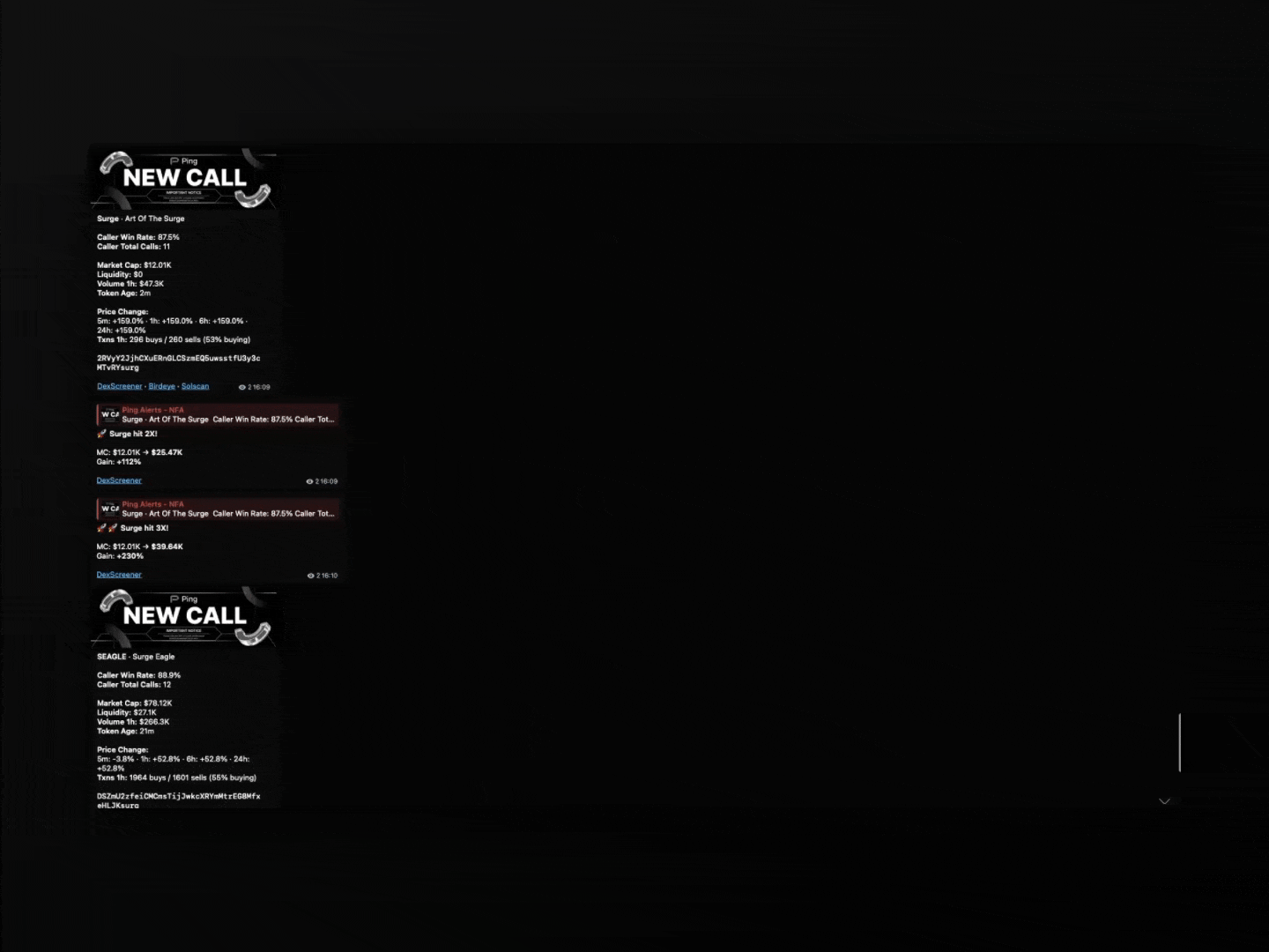 See top gains, token pages with charts showing exactly where callers called. Holder concentration, market cap history, and direct links to DEXTools, DEXScreener, and X (formerly Twitter) — all in one place.